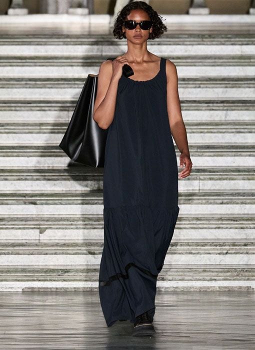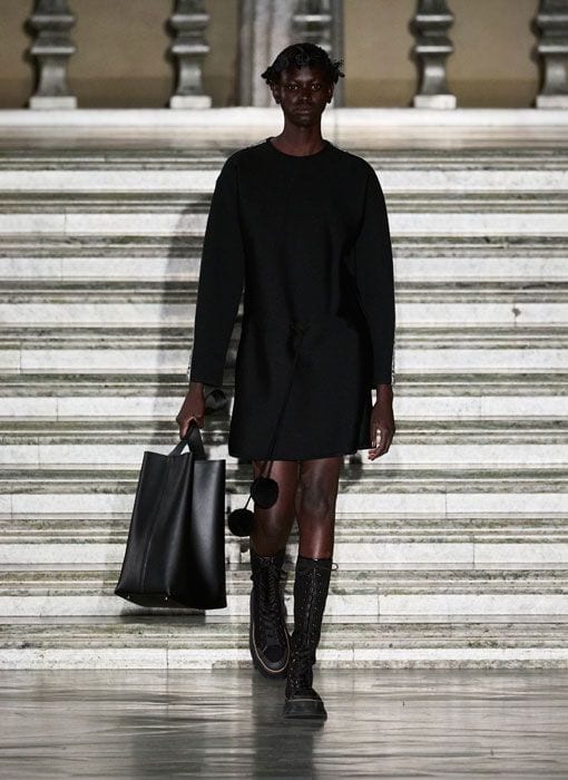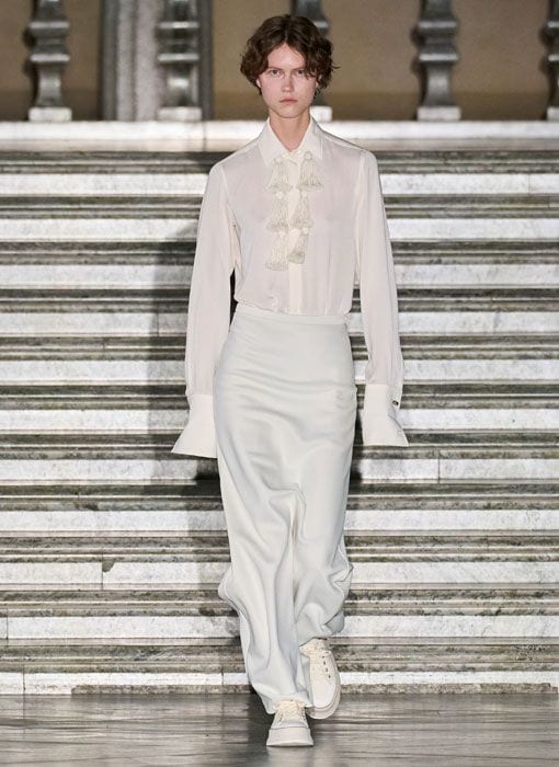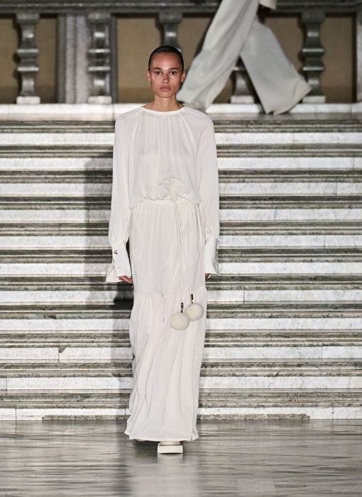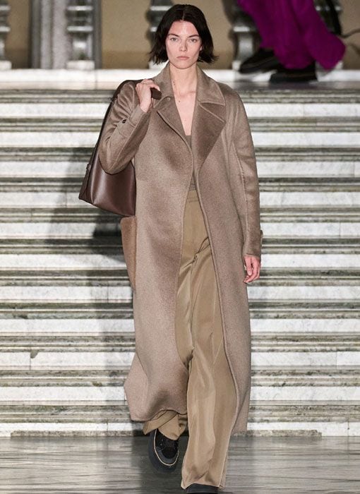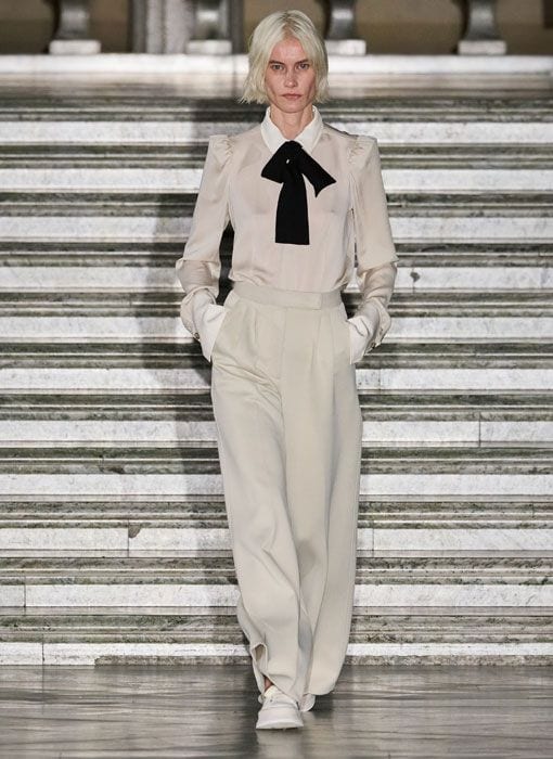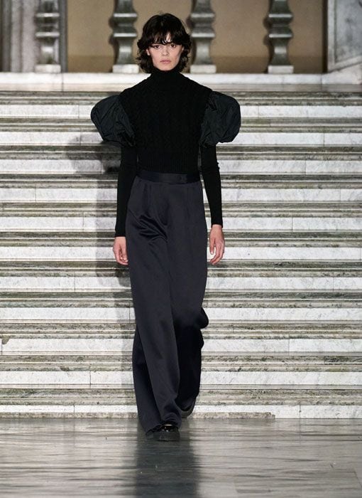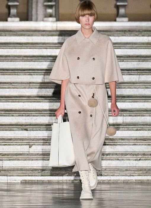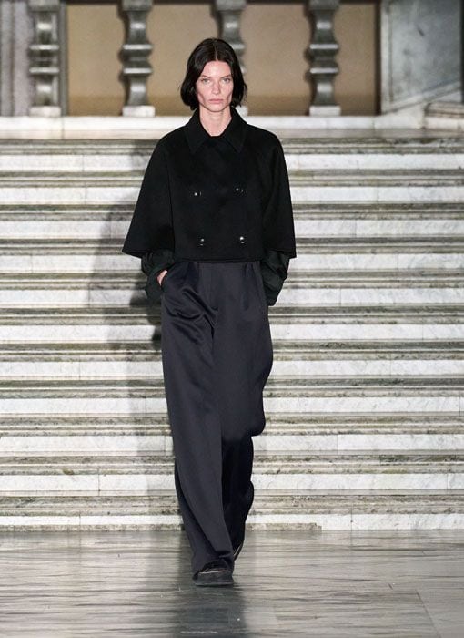 Maniche gigot, gonne che sfiorano le caviglie, cappe al gomito e da indossare con papillon: la silhouette sartoriale e lo stile austero del 1900 vengono reinterpretate in chiave moderna in questa collezione Max Mara.