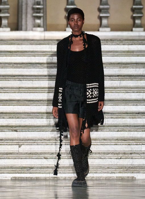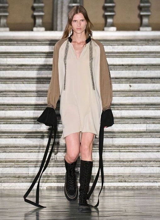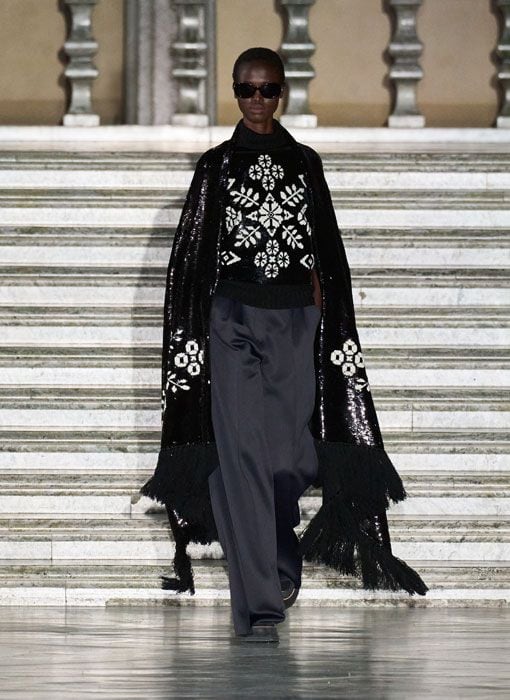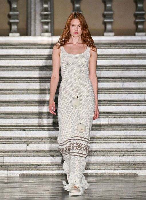 Le tuniche fluttuanti, lunghe e corte, impreziosite da trecce nero e avorio, pom-pom, nappe e borchie, sembrano danzare con i motivi folk.