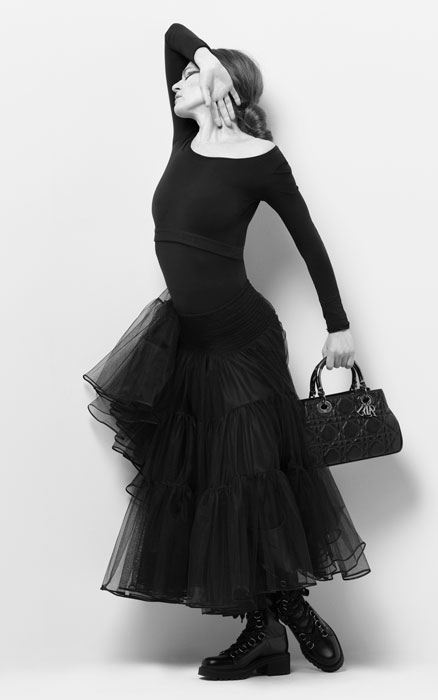 Il dialogo artistico appassionato tra Maria Grazia Chiuri e la coreografa, che ha dato vita a diverse collaborazioni, continua in questo balletto ipnotico. La ballerina sfoggia così questo nuovo accessorio essenziale in pelle nera, proposto in una versione media.