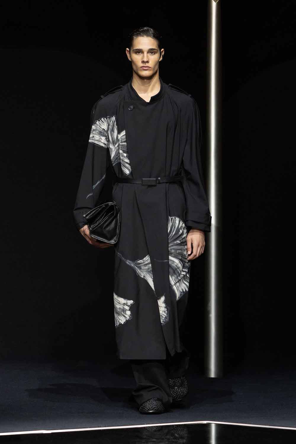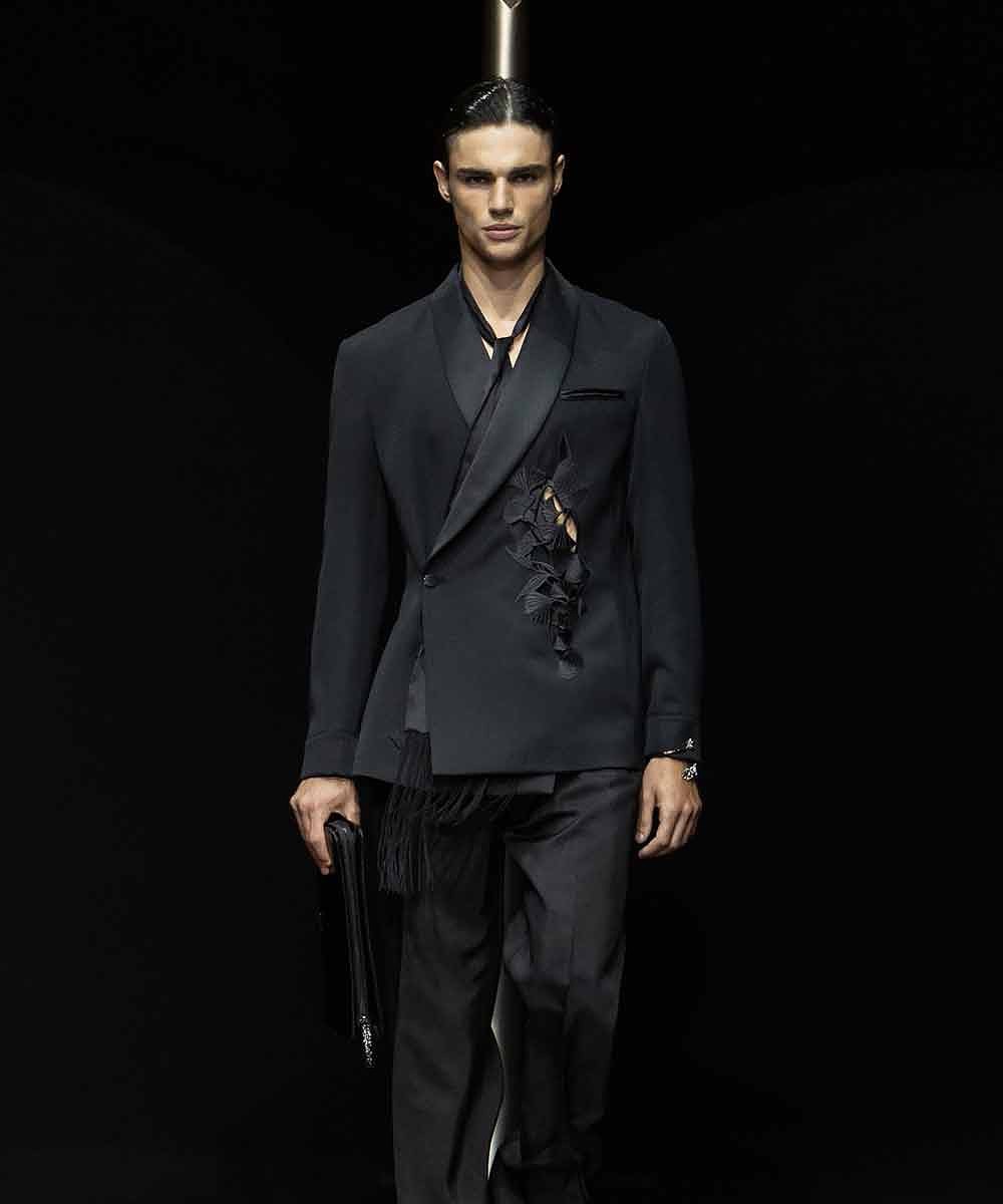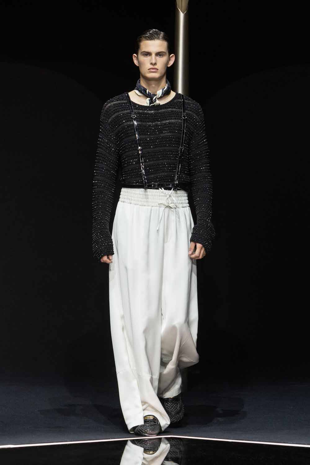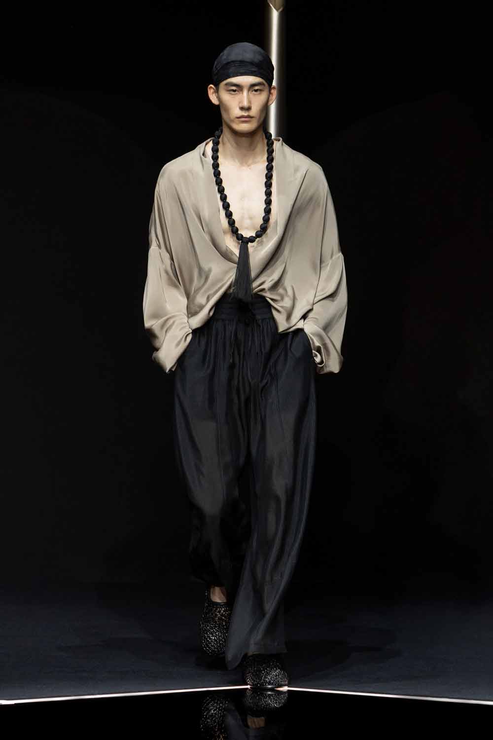 Bagliori di luna su un paesaggio marino, su scogli arsi e scene deserte. Il buio che dilaga, rischiarato da una luce che rende le superfici scintillanti e oleose. Questa collezione è un ritorno a temi legati all’essenza di Emporio Armani, epurati e visti oggi attraverso il filtro di un chiaro di luna. Si respira un romanticismo secco ma vibrante, che muove tra l’Oriente estremo e un ipotetico Nordafrica.