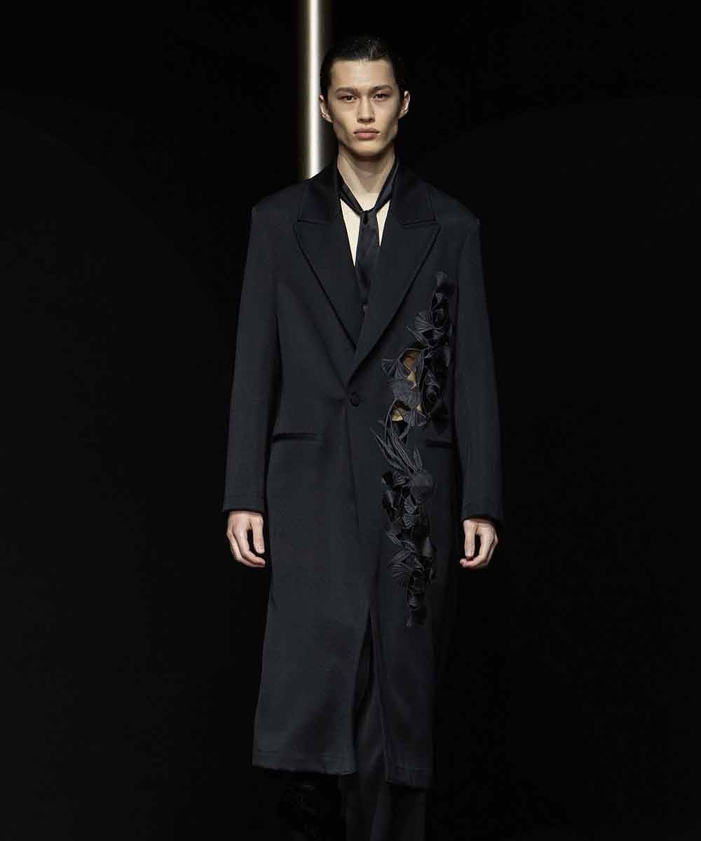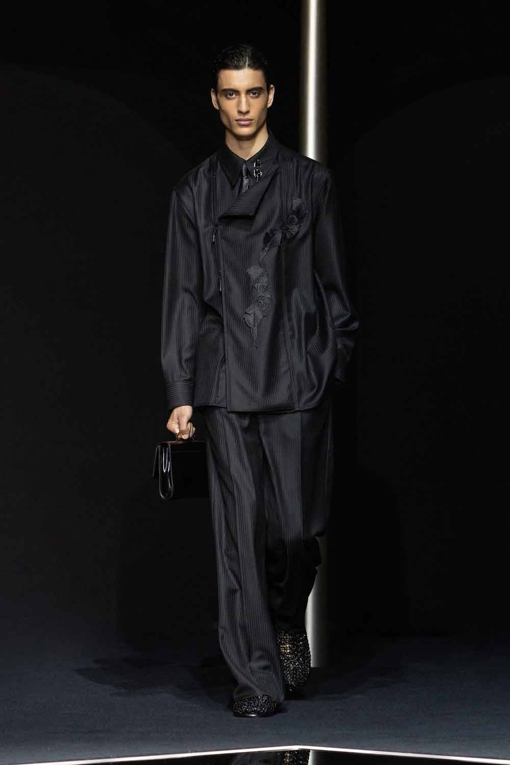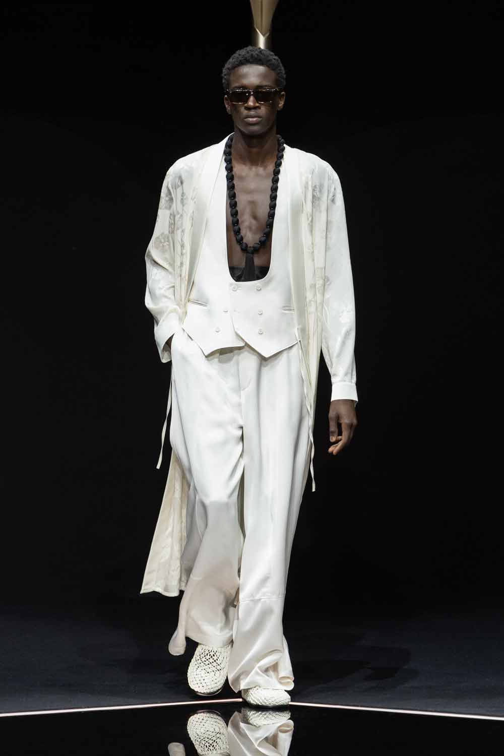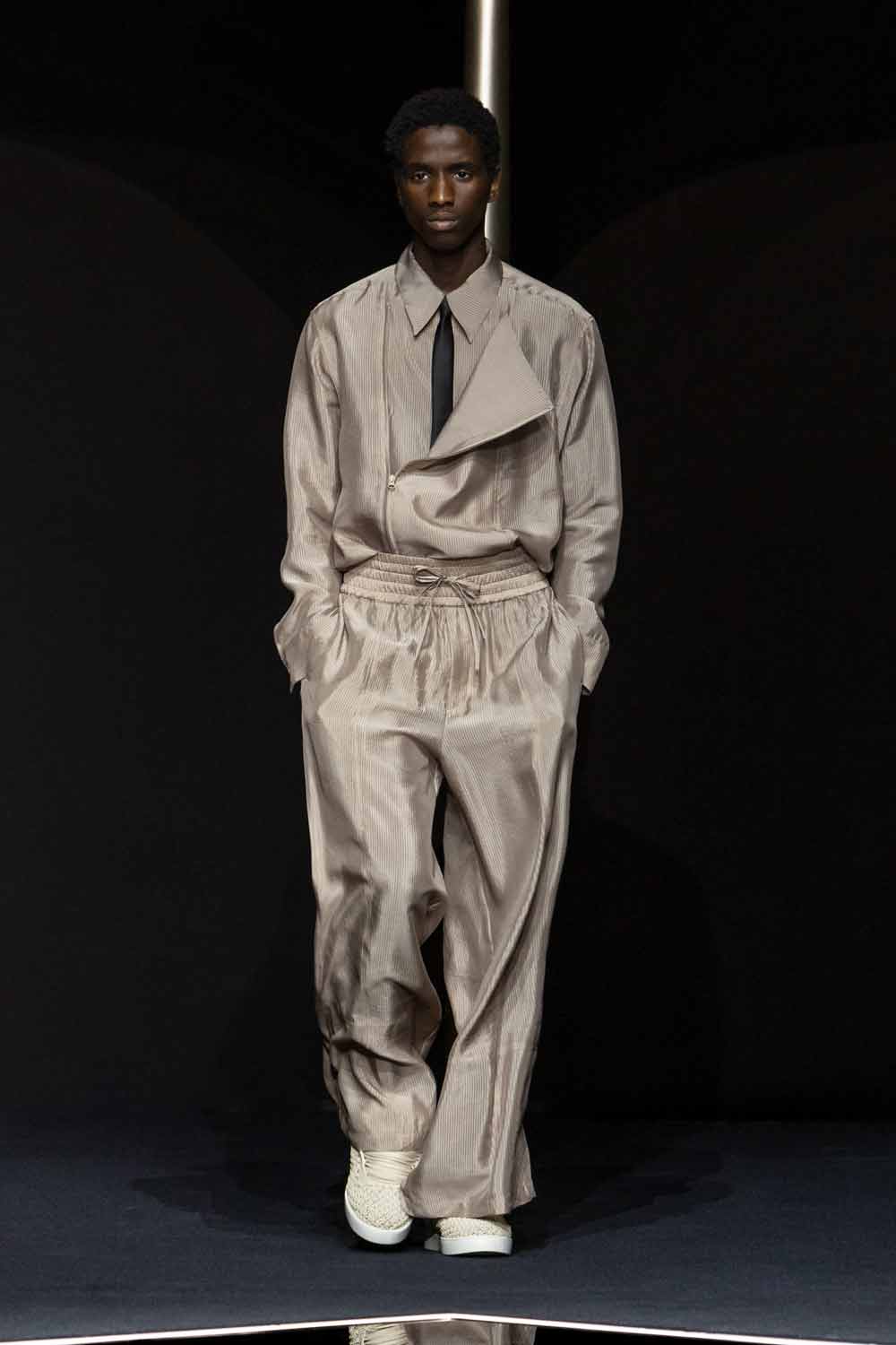 Bagliori di luna su un paesaggio marino, su scogli arsi e scene deserte. Il buio che dilaga, rischiarato da una luce che rende le superfici scintillanti e oleose. Questa collezione è un ritorno a temi legati all’essenza di Emporio Armani, epurati e visti oggi attraverso il filtro di un chiaro di luna. Si respira un romanticismo secco ma vibrante, che muove tra l’Oriente estremo e un ipotetico Nordafrica.