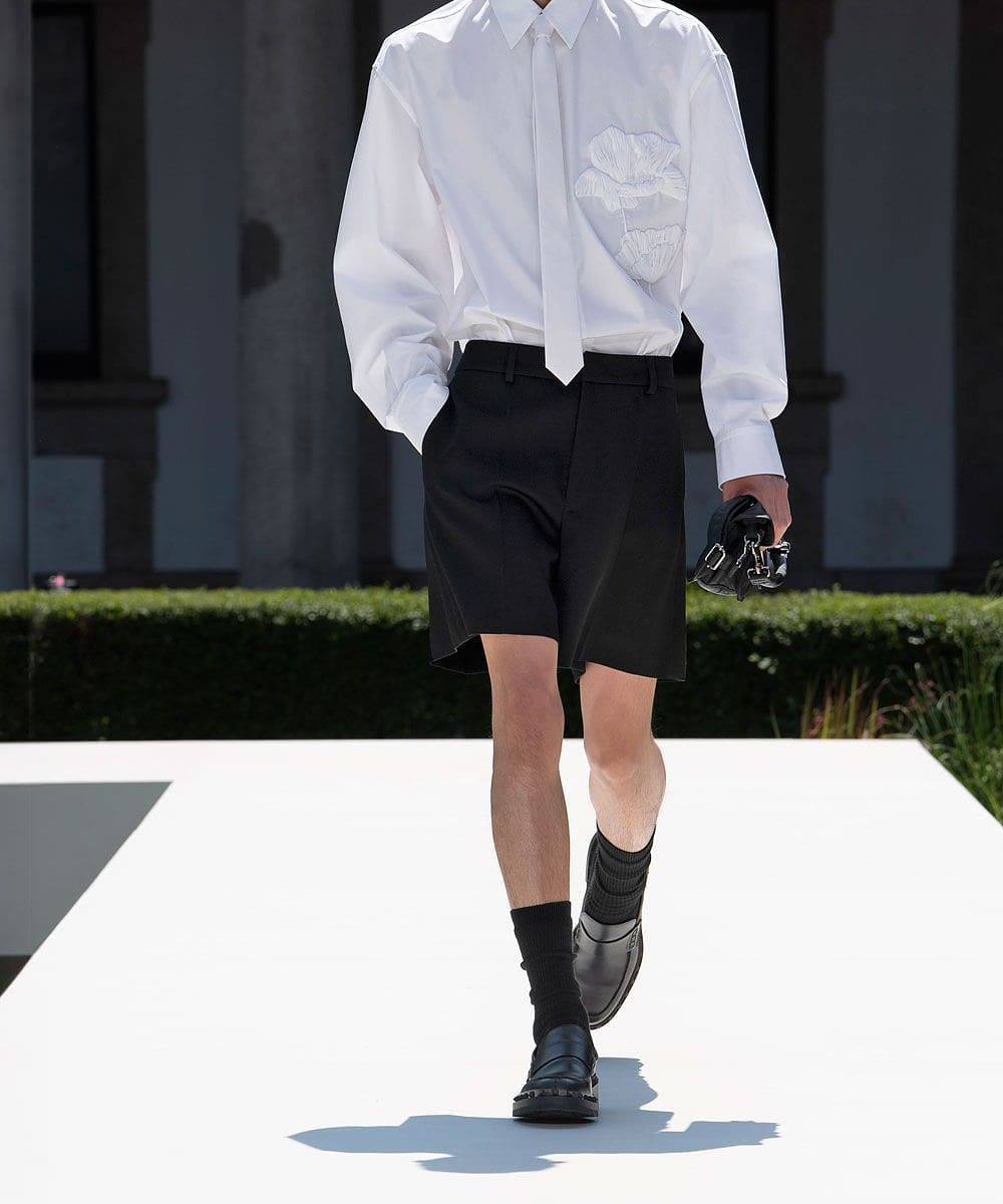 I blazer e i cappotti sartoriali sono portati con shorts corti, addolciti e resi più casual, con l’aggiunta di una nota giovane ed energica. I classici capi per il lavoro, le uniformi della virilità che ci sono familiari, sono trattati con delicatezza, mentre le forme di tutta la collezione evolvono in modo sottile, quasi