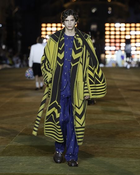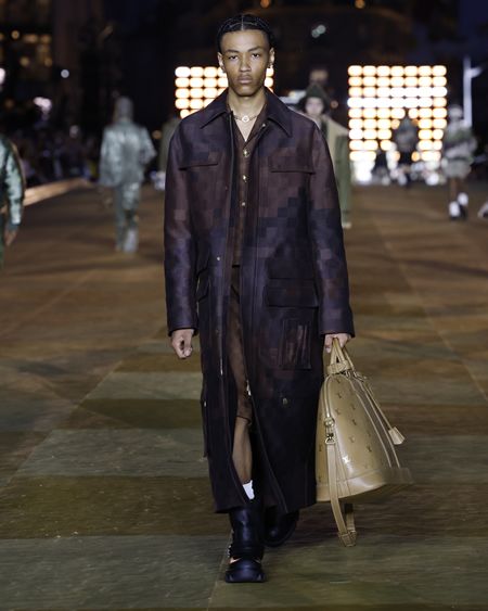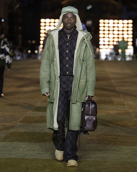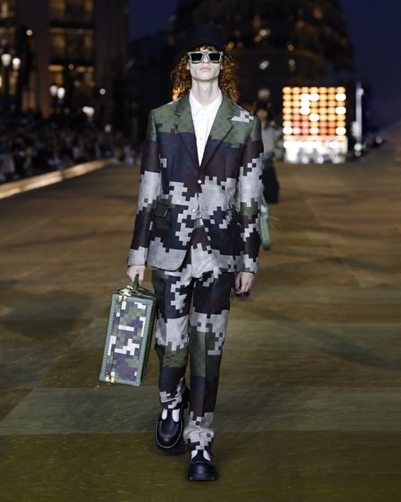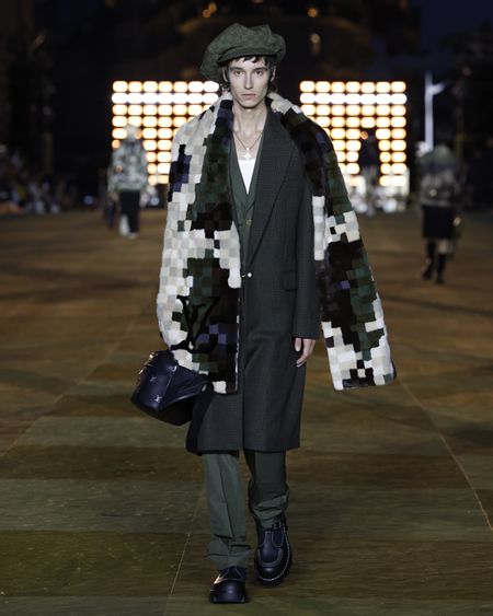 E ancora, l’essenza del Damoflage cattura l’essenza della natura e l’eco del suo richiamo outdoor. Le tonalità del camuffamento si tingono dei colori di paesaggi vividi e suggestivi, materializzandosi in stampe jacquard su cappotti, blouson, pigiami e camicie. E se l’outfit non fosse già una dichiarazione di stile abbastanza audace, l’iconico motivo floreale Louis Vuitton appare tagliato al laser su capispalla e borse, come un ulteriore tributo all’immaginario floreale che contraddistingue la Maison.