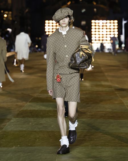 La sartoria si spinge oltre i confini tradizionali con tailleur che sfoggiano shorts con pieghe. Un elemento di sorpresa che si immerge nella tradizione sartoriale, ma ne rinnova l’estetica con un tocco di modernità. Questo intero ensemble, una fusione tra passato e presente, evidenzia una visione di stile che sposa il comfort del contemporaneo con l’eleganza senza tempo della sartorialità.