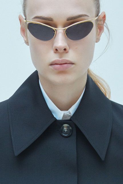 Gli accessori completano il look raffinato e audace della collezione Resort. Affusolati occhiali da sole hi-tech dal profilo dorato guardano verso il futuro, combinando eleganza e tecnologia.