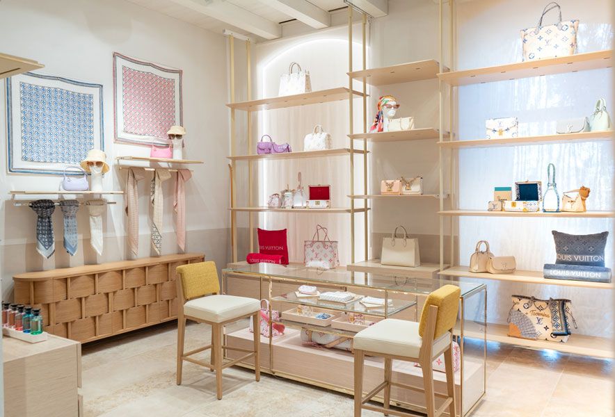All’interno del negozio, l’atmosfera è intima e accogliente. Arredi vintage, dettagli in legno naturale e tocco siciliano con tappeti Maiolic e carta da parati in rafia. E poi, c’è la collezione “LV By The Pool” con abiti, borse, scarpe e molto altro ancora. Non perdere l’esclusiva borsa “Taormina Neverfull”, disponibile solo qui!