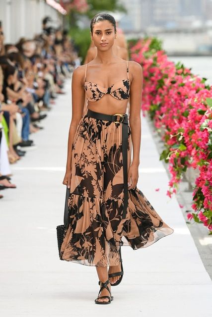 La collezione si distingue per le sue silhouette: snelle e seducenti, che oscillano tra audaci miniabiti e drappeggi fluttuanti che sfiorano il pavimento. Gonne con spacchi audaci, caftani ariosi e abiti fluidi evocano paesaggi esotici e tramonti sul mare. La palette cromatica, con toni delicati di melone, fresia e geranio, si fonde con audaci stampe floreali e motivi grafici di giraffa, creando un mosaico di sensazioni e ricordi.
