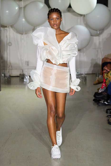Capi eterei ad inizio sfilata rappresentano il sentirsi smarriti e isolati. Poi silhouette audaci rispecchiano la forza ritrovata da Ashlyn per superare il buio del passato. L’apoteosi con un gigantesco piumino-fenice, un manifesto di rinascita e possibilità infinite.