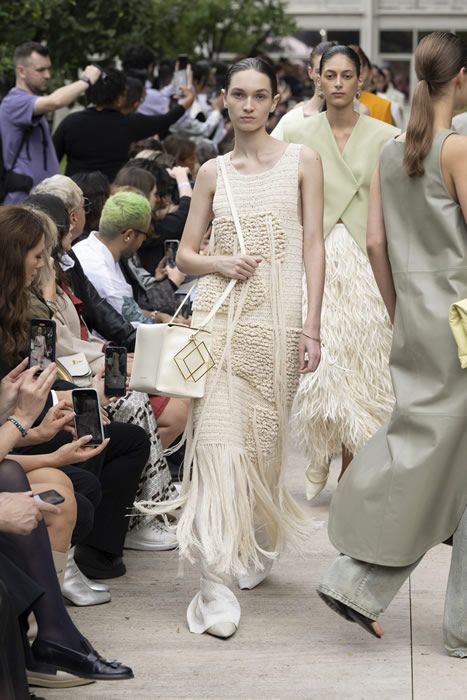La collezione di Calcaterra per la Primavera/Estate 2024 è un ode alla semplicità raffinata. Ogni pezzo rivela un’attenzione ai dettagli che solamente un artigiano dedicato potrebbe offrire: ricami a mano eseguiti con filo e perle di fiume naturali, piume lavorate con cura, e trasparenze che giocano con la luce, donando a ogni indumento un’aura eterea.