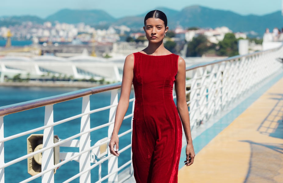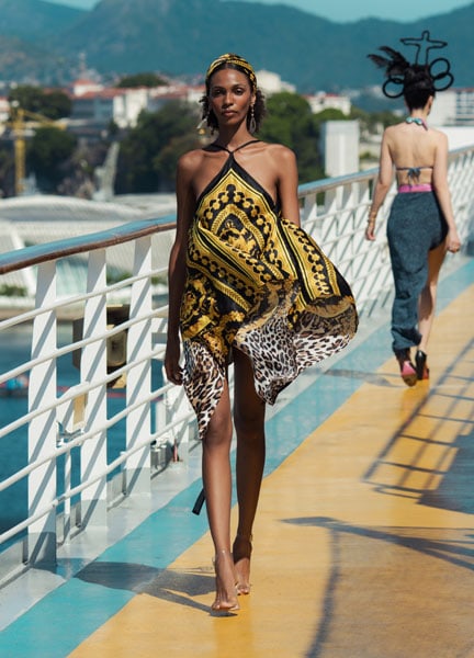 Un crescendo di emozioni ha seguito con Jessica emergente in un abito rosso strutturato, un mix audace di stile anni ’80 e contemporaneità, che esalta perfettamente la sua silhouette. Completato da un’acconciatura ispirata al Cristo Redentore, realizzata da artisti brasiliani, questo look si è rivelato un vero punto di svolta dello show. La passerella, sospesa tra il mare cristallino e lo skyline di Rio, ha offerto un palcoscenico da sogno alle modelle, che hanno sfilato in un contesto unico e suggestivo.