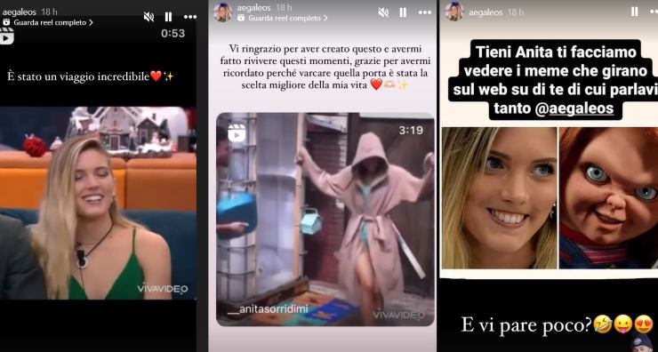 Dopo l’eliminazione al Grande Fratello, Anita ha potuto riprendere il suo cellulare ed è tornata sui social dove ha re-postato alcuni scatti che parlano della sua amicizia con Garibaldi; ha anche dedicato dolci pensieri al nuovo ‘fidanzato’.