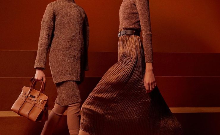 Nella collezione autunno-inverno, protagonisti della collezione firmata da Nadège Vanhee-Cybulski sono stati i colori caldi e i look tinta unita, dalle linee pulite e avvolgenti. Insieme a piumini simili a trench e linee femminili e sinuose, ha sfilato anche una Birkin marrone avvolta in una particolare “cella” formata da cinghie verticali ed orizzontali che si incontravano perpendicolarmente.