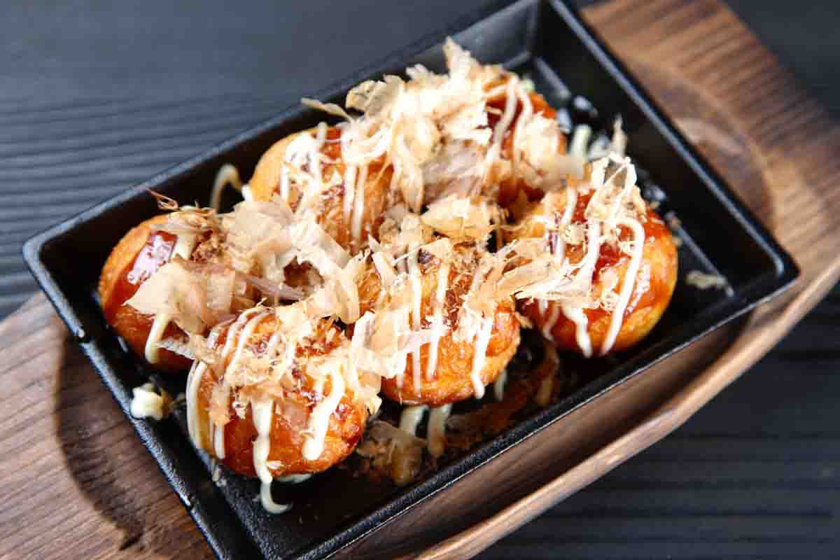 - Una volta pronte, togliere le polpettine dalla padella e disporle su un piatto. Cospargere le polpettine con katsuobushi (scaglie di bonito secco) e alga nori tritata finemente. Completare il piatto con salsa takoyaki e una generosa spruzzata di maionese. Servire le polpettine di polpo calde e gustarle mentre sono ancora croccanti.