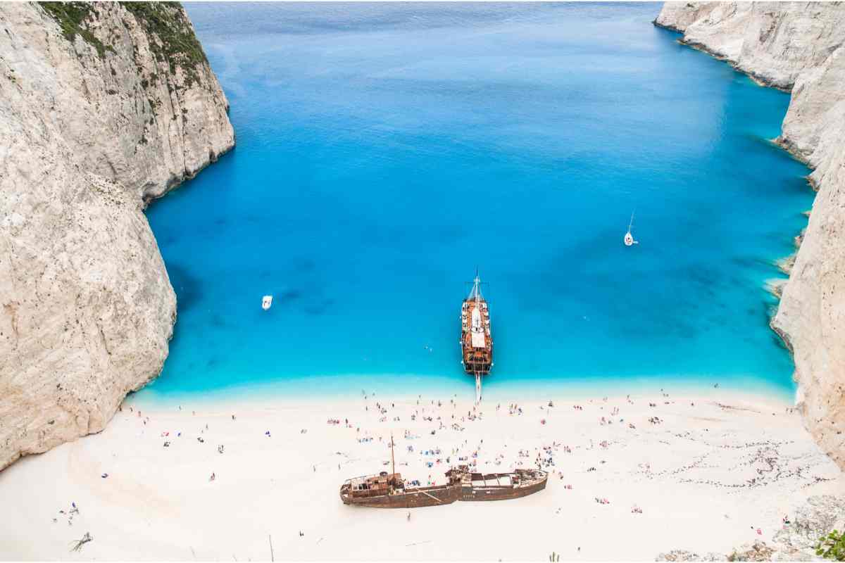 - Spiaggia del Navagio ( o anche spiaggia del relitto), Zante. Arrivare a questa spiaggia non è affatto semplice, perché è costeggiata da scogliere altissime. Per questo motivo la si può raggiungere solo attraverso imbarcazioni assicurate che sanno come costeggiare la costa. Arrivati qui si può osservare il relitto sulla spiaggia, ossia una barca in legno e fare il bagno in un mare davvero incredibile.