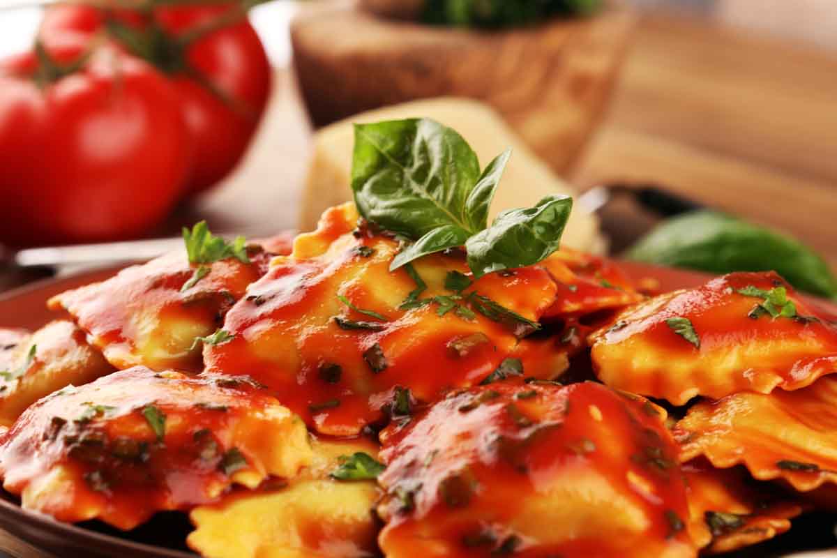 - Cottura e condimento: far bollire i ravioli in acqua salata fino a quando non vengono a galla. Scolare i ravioli e saltarli per circa 30 secondi nel sugo di pomodoro appena preparato.