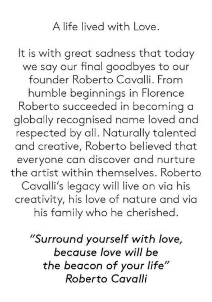 Anche Victoria Beckham ha condiviso una sua foto con Cavalli nelle sue storie su Instagram, scrivendo: «Mi dispiace tanto sentire la triste notizia della scomparsa di Roberto. Sarà per sempre un’icona.»