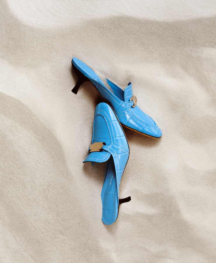 Davis reinterpreta la ballerina iconica del brand con nuove proporzioni. La punta allungata e la silhouette slanciata suggeriscono un’eleganza leggermente sovversiva, mentre il dettaglio metallico macro infonde un tocco minimalista e giocoso.