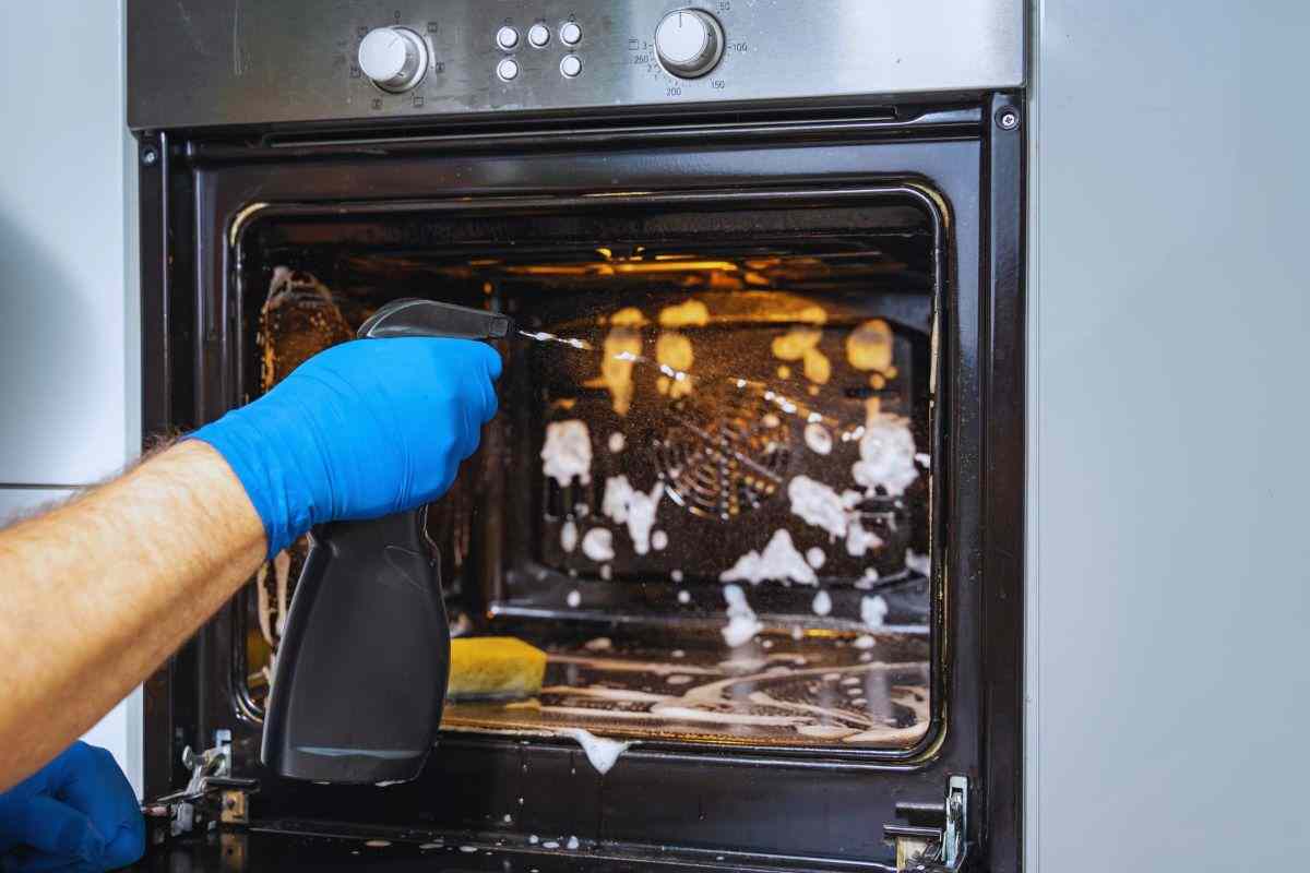Basta mescolare parti uguali di aceto bianco e acqua e spruzzarlo sul forno sporco. Lascialo agire per 15-20 minuti, quindi pulisci con una spugna o un panno.