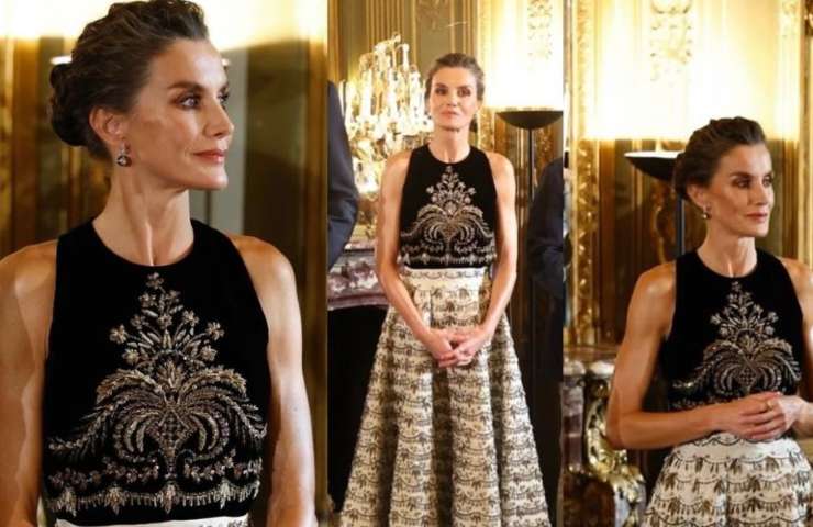 Per la primissima volta, Letizia di Spagna si è affidata alle mani di Dior per un evento di tale portata, omaggiando così la Francia, indissolubilmente legata alla Maison. L’abito sfoggiato dalla Oriz per la cena di gala fa parte della collezione primavera – estate 2024 della firma di alta moda – ispirata all’aurea e i suoi significati e simbolismo – ed è frutto del genio creativo di Maria Grazia Chiuri.