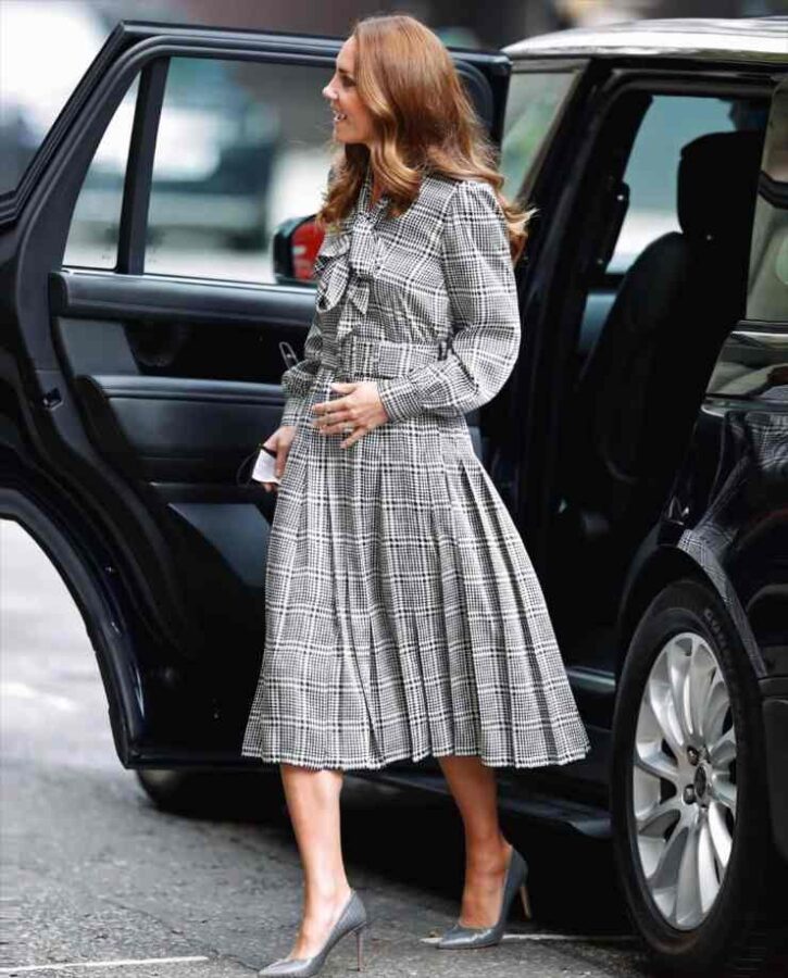 Kate ha per esempio riciclato il midi dress svasato plissé indossato durante la visita al Center for Longitudinal Studies at University College London per un’altra occasione importante, ovvero la commemorazione delle 144 vittime del disastro di Aberfan, presso l’Aberfan Memorial Garden. In entrambe le occasioni il look è stato identico, con un abito midi svasato in gonna plissettata, maniche morbide e semi sbuffate sui polsini, maxi cintura avvitata in vita e fiocco sul petto.