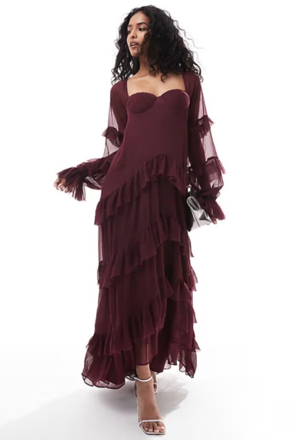 Quando l’appuntamento prevede una cena a lume di candela in un ristorante esclusivo, il dress code richiede un’eleganza impeccabile. Niente di meglio di un abito lungo bordeaux a balze, come quello firmato Asos Design. Il fondo asimmetrico dona movimento e leggerezza, mentre il dettaglio stile corsetto enfatizza il punto vita con grazia. Le maniche a sbuffo e lo scollo a cuore completano l’effetto romantico e femminile.