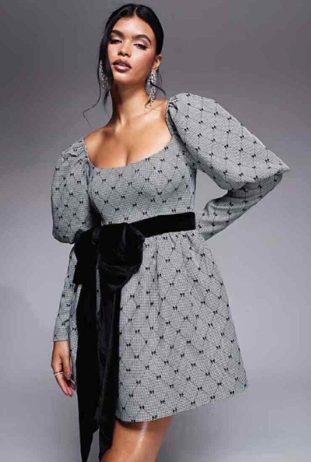 Lo scollo rotondo e la cintura in vita con il grande fiocco esaltano la silhouette, mentre il motivo decorativo con piccoli fiocchetti aggiunge un’allure romantica e un pò parigina. Per valorizzarlo al meglio, si possono scegliere delle ballerine a punta con dettagli gioiello e una mini bag rigida. Il tocco finale? Un rossetto rosso vellutato, per un effetto chic senza tempo. Puoi chiudere l’outfit con una pelliccia sintetica crop, magari nera.