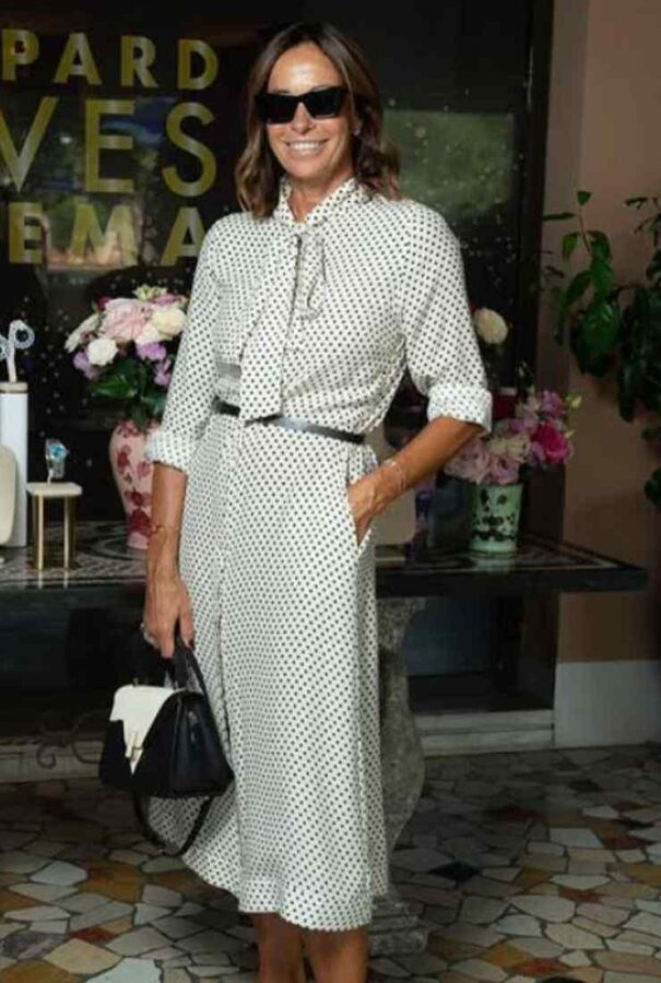 Poi c’è il Brindisi, un altro chemisier in seta, con la stampa a pois che ormai è diventata una firma visiva del marchio. Questo ha le maniche corte, l’elastico in vita, un colletto che si ispira a quello alla coreana e delle tasche che sembrano quasi un dettaglio casuale, ma in realtà fanno tutta la differenza. Costa 800 euro, ed è un abito semplice ma curato, che Cristina porta spesso nei contesti più informali, ma non passa mai inosservato. Ha quella qualità strana di farti sentire ordinata anche quando sei in ritardo o non hai dormito benissimo. Non capita con tutti i vestiti, ma con questo sì.