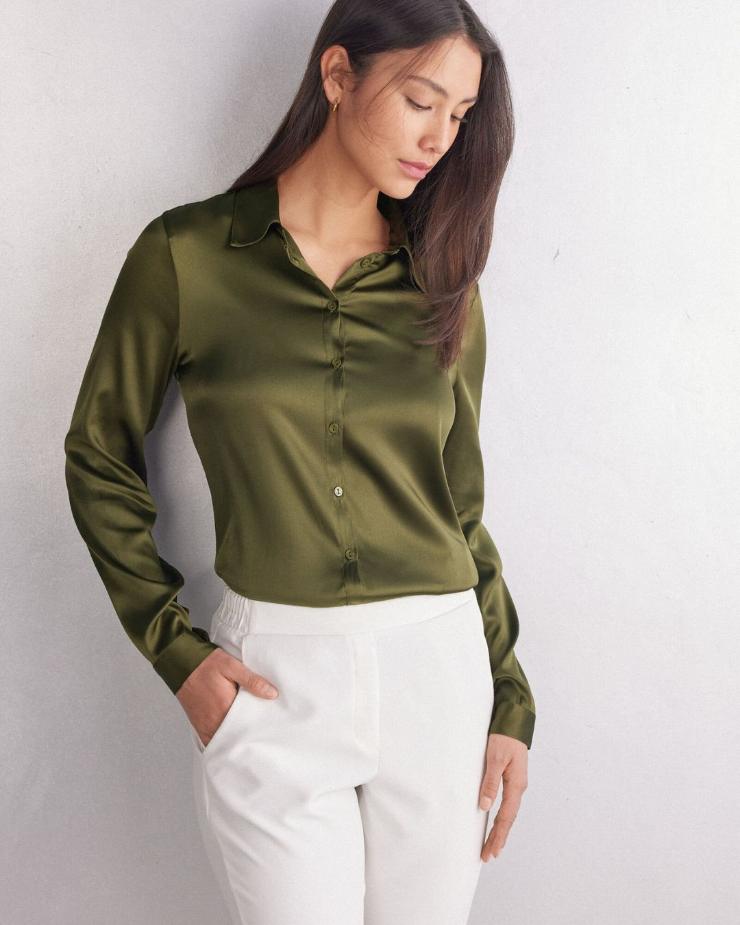 Proprio il brand spagnolo tra le tante tendenze kaki ci regala questo meraviglioso midi dress asimmetrico con una sfumatura molto speciale, glossy e che fa quasi venire voglia di assaggiarla. Ciononostante, questo colore dominante si presta anche alle accezioni a righe su sfondi bianchi come possiamo vedere sempre con la camicia Zara, ma anche con il satinato, che non solo rende molto morbido il look, ma enfatizza la stessa preziosità della nuance tramite giochi raccolti di luce.