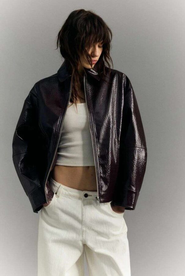Infatti non bisogna pensare che il giubbotto di Bershka sia solo per outfit casual. L’effetto vinile è proprio ciò che lo rende perfetto anche per creare look più eleganti senza troppa fatica. Immaginatelo anche con una gonna in pelle e una camicia morbida, insomma quel giusto connubio di grintoso ed elegante che fa sempre colpo.