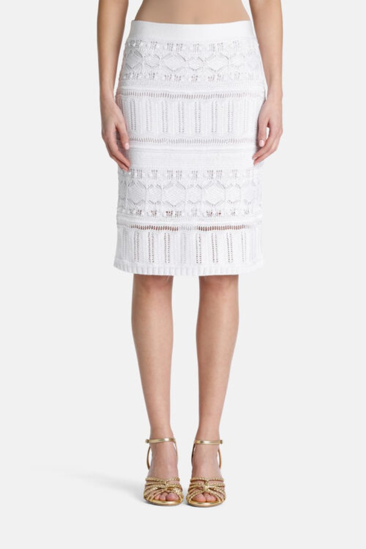 Concludiamo con un vero pezzo d’arte, una gonna in maglia tubino davvero elegante, impreziosita da dettagli ajour che lasciano intravedere la fodera trasparente sottostante, a sua volta facendoci gustare il colore della nostra pelle. Il dettaglio di lavorazione in maglia poi a motivi geometrici si allaccia a dovere con la tendenza di quest’anno verso lo stile granny, pertanto con la forte presenza di merletti, pizzo sangallo, lavorazioni crochet e così via. Luisa Spagnoli ancora una volta ci lascia senza parole!