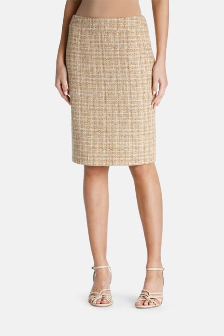Per uno stile invece che richiama gli anni 80 e il più classico principe di Galles troviamo questa gonna beige e oro in tessuto armaturato e filato di lurex che crea giochi di luce preziosi ma delicati e non invadenti. La chiusura posteriore con zip invisibile permette di ottenere un effetto fasciante coinvolgente, adattandosi perfettamente alla nostra body shape. La trama infine richiama anche stavolta i più classici tailleur chanelliani, sempre con un pizzico di modernità che non lascia affatto niente al caso!