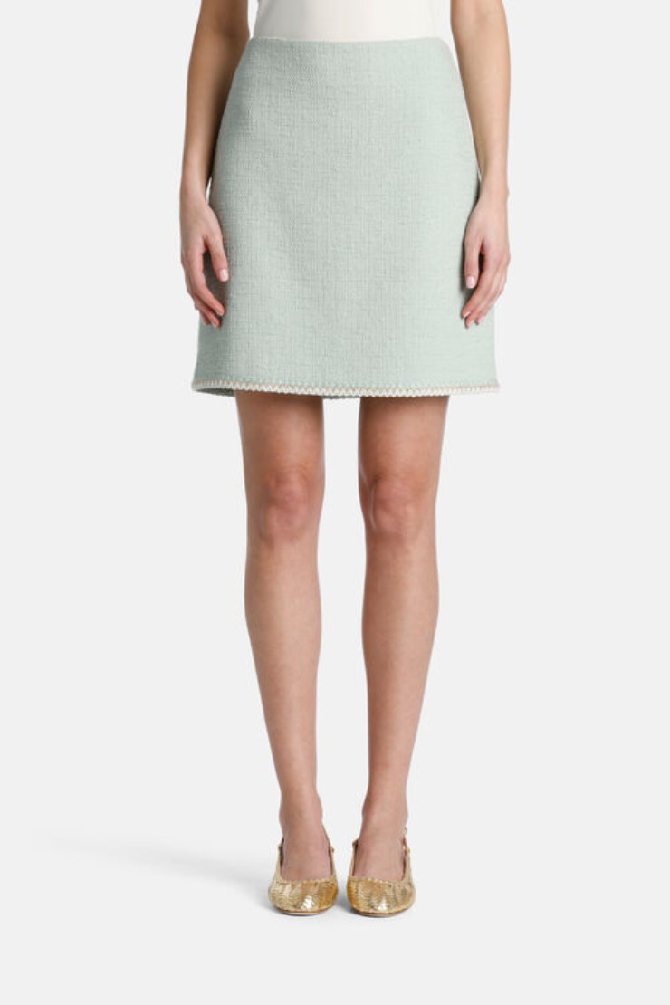 Sulla stessa scia della prima troviamo poi una gonna dalla linea tubino appena appena svasata, di un verde menta ghiacciato davvero ‘goloso‘: chiusura invisibile a zip laterale, dettaglio di ricamo sull’orlo e realizzata in cotone armaturato in linea con le classiche accezioni Chanel del tailleur. Il taglio al di sopra del ginocchio è un dettaglio moderno che può permettere la possibilità di indossare collant leggeri oppure più pesanti e strutturati per le ultime serate primaverili fresche.
