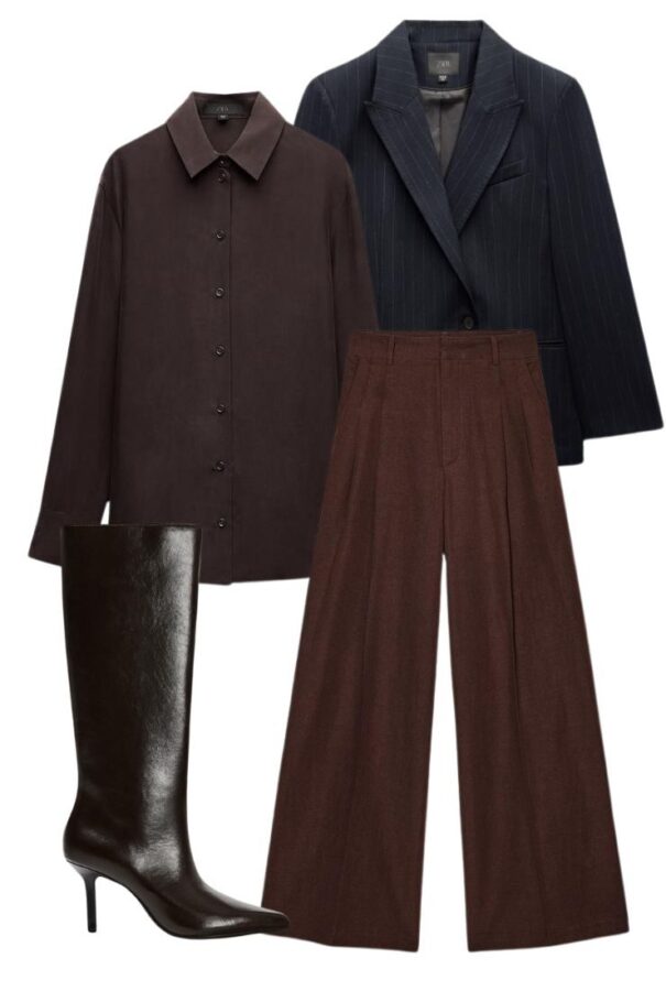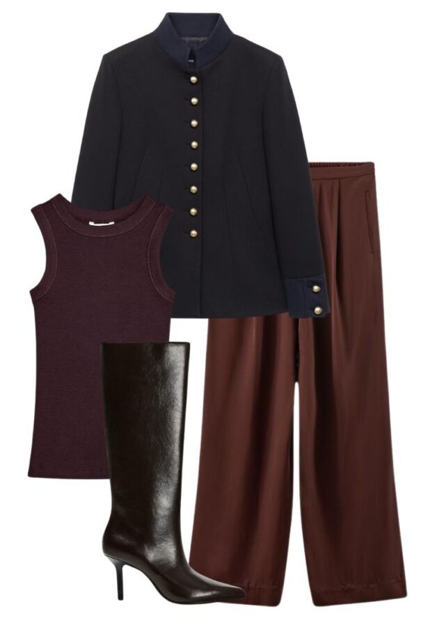 E ora passiamo al secondo outfit, che mischia Zara e Mango in un modo furbo e, diciamolo, super riuscito. Qui il pezzo forte è la giacca di Mango, con il collo alla coreana increspato e quei bottoni gioiello che, senza strafare, fanno la differenza. È una giacca che si nota ma resta elegante, non ti mangia il look. Sotto, da Zara, ci butti dei pantaloni morbidi in viscosa satinata, che sono una goduria da portare, perché hanno l’elastico dietro e non ti costringono la vita. La t-shirt a costine giromanica, semplice semplice, tiene tutto leggero e fresco, senza togliere carattere all’insieme. Ai piedi di nuovo gli stivali sottili, in una sfumatura calda di marrone, perfetti per riprendere i colori della giacca.
