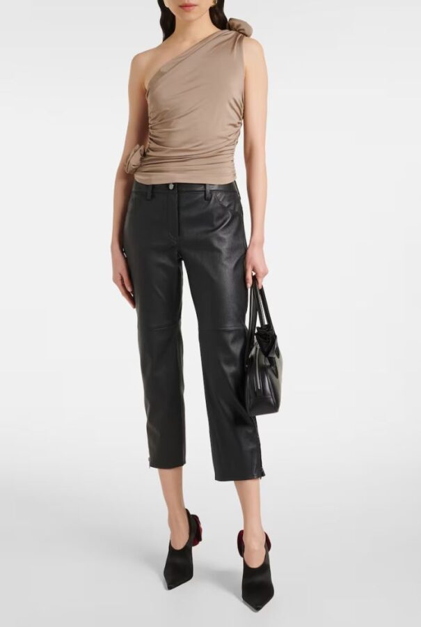 Se invece vuoi andare su qualcosa di più importante, i pantaloni capri in pelle firmati Magda Butrym cambiano le regole del gioco. Niente compromessi: pelle vera, taglio pulito, vita bassa e rifiniture perfette. Si vede che sono pensati per chi guarda ai dettagli, per chi vuole distinguersi ma con discrezione. Hanno una fodera interna in cotone che li rende portabili anche per più ore, senza l’effetto sauna. Ma il prezzo, qui, sale parecchio: 1.720 euro. Un investimento, senza dubbio, ma anche un capo destinato a durare più di una stagione.