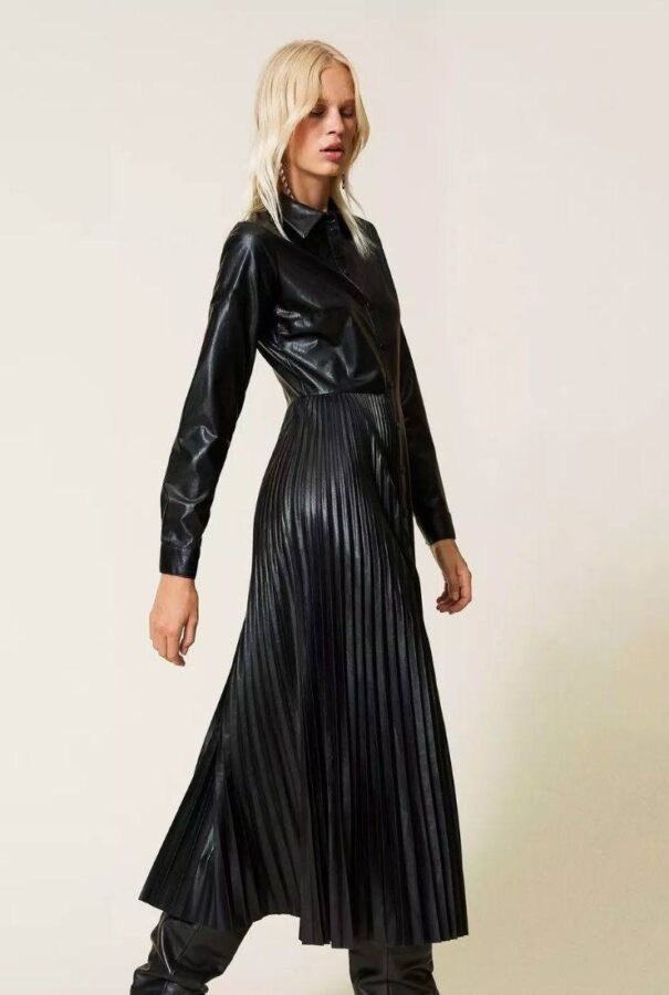 Se ti stai chiedendo come replicare un look simile senza venderti un rene, ci sono opzioni interessanti che non richiedono budget da première a Cannes. Partiamo dall’abito chemisier di Twinset Milano. Non ha la griffe francese, ma regge il confronto. Il tessuto spalmato ha quella consistenza lucida ma non rigida, perfetta per chi cerca un capo d’impatto che rimane comodo.
