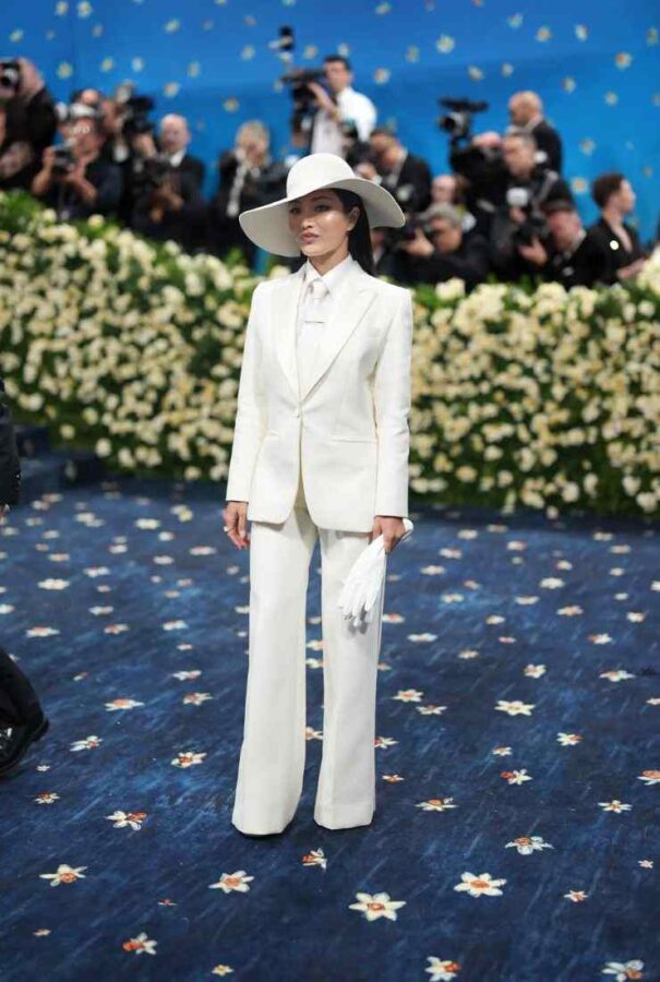 Ma ritornando al caso mediatico che accennavamo, le protagoniste sono state Zendaya e Anna Sawai. Due donne incredibili, due carriere diverse, due nazionalità lontane. Eppure, la stessa scelta cromatica, lo stesso richiamo anni ’70, quell’eco inconfondibile di Bianca Jagger in completo bianco. Zendaya è arrivata con pantaloni a zampa, giacca aderente, gilet, cravatta e quel cappello a tesa larga che dava al tutto un’aria da diva anni d’oro di Hollywood. E fin qui, tutto perfetto. Ma poi, a pochi minuti di distanza, ecco Anna Sawai sfilare con un completo quasi gemello. Stessa palette, stessi riferimenti stilistici.