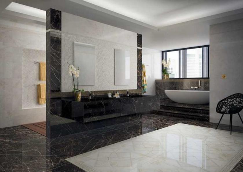 La forma quadrato/rombo super squadrata si fonde con questi semi cerchi curvi molto morbidi, creando nell’intero pavimento un effetto pazzesco da cima a fondo. Di contro poi, come dicevamo prima, troviamo un’altra anima di Versace, di quelle scure e profonde, a tratti semi gotiche ma che lasciano comunque senza fiato. Anche questa mattonella è in gres porcellanato, qui però troviamo l’effetto marmo della Emote Nero Amasanta, sembra quasi di avere davanti un effetto scheggiato e lineato che tuttavia connotano una profonda eleganza.