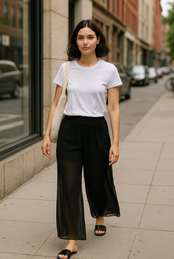 Il georgette è un tessuto con memoria. Viene dalla seta, ma si declina anche nel poliestere, in modo più accessibile. Ha un aspetto opaco, una consistenza leggermente ruvida, una caduta che non cede. Non si appiccica, non segna, non costringe. Questo lo rende ideale per chi cerca un look fluido ma non sciatto. Durante il giorno, i pantaloni in georgette danno il meglio. Bastano una t-shirt bianca un po’ morbida, una camicia ampia lasciata fuori, sandali flat o sabot. Chi preferisce un tocco più sportivo li porta con sneakers leggere.