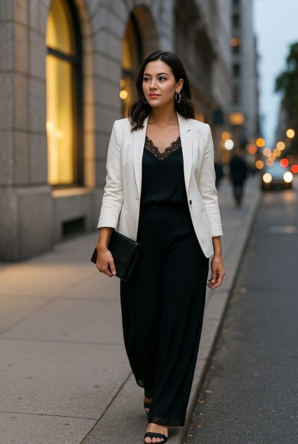Ci sono versioni palazzo con fodere corte, da portare con una camicia ampia e un paio di sabot. Oppure tagli culotte, con gamba larga ma accorciata, perfetti per chi vuole qualcosa di meno impegnativo. Ma i più riusciti sono forse i total black, minimali, che funzionano anche la sera con un body aderente e un tacco discreto. E magari una bella giacca bianca a contrasto.