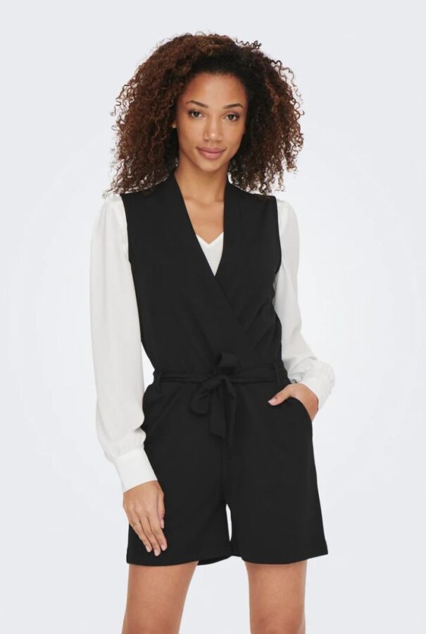 Tuta corta nera con cintura: comoda di giorno, perfetta la sera