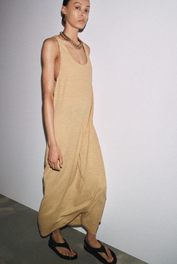 Poi c’è il vestito midi in cotone e lino di Zara, color cammello, con taglio svasato. Il tipo di vestito che accompagna il corpo senza costringerlo, e questo fa tutta la differenza. Ha lo scollo rotondo, il giromanica pulito, una linea fluida che lo rende adatto anche a chi non ama gli abiti troppo segnati.