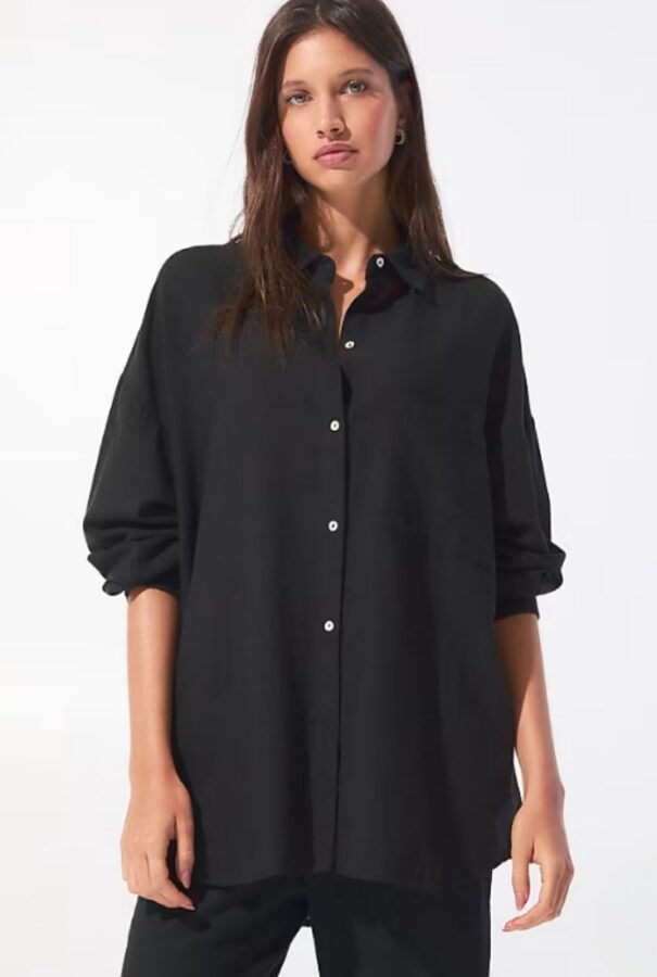 Restando su tessuti leggeri, la camicia oversize effetto lino di Pull&Bear, nera, merita una menzione. Ha un taglio rilassato, ma non trasandato. Il colletto è ampio, i bottoni discreti, le maniche lunghe ma arrotolabili per un’aria più estiva.