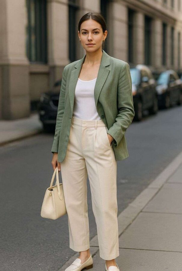 E infatti, lo si vede tanto in outfit rilassati quanto in mise più curate. Un pantalone largo salvia con una semplice t-shirt bianca funziona per un sabato in città. Una camicia morbida portata dentro jeans a vita alta e sneakers bianche è perfetta per quando vuoi essere curata ma senza sforzo. Chi lavora in ambienti non troppo rigidi può osare un blazer di lino salvia su un total look bianco, fresco e preciso. E per le cerimonie estive? Lì il verde salvia dà il meglio di sé.