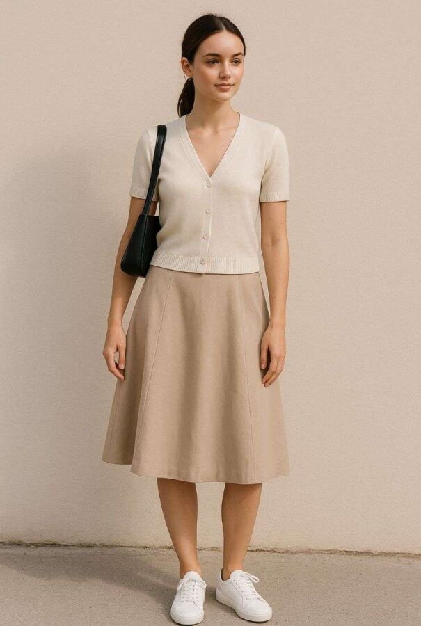 Il tema dei materiali non è secondario. Cotone, lino, maglia leggera, viscosa… tutto ciò che cade bene senza segnare. I tessuti fanno la differenza perché aggiungono struttura senza rigidità. Un cardigan leggero nei toni della pelle, ad esempio, diventa un ottimo jolly nelle mezze stagioni. E anche un abito a colonna, magari cipria o avorio, può diventare un pezzo chiave se portato con sandali flat o sneakers bianche.