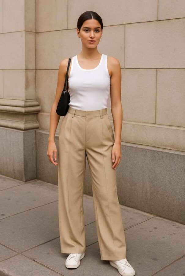 Nella pratica, costruire uno stile così non significa replicare quei personaggi. Significa capire che tipo di capi funzionano davvero ogni giorno. La canotta bianca, ad esempio, torna sempre. Aderente ma non costrittiva, funziona con un cargo largo, con un pantalone sartoriale, sotto un blazer destrutturato. La forza sta nella sua versatilità. Stesso discorso per il pantalone ampio in toni neutri. Grigio chiaro, taupe, beige caldo, sono colori che reggono ogni abbinamento. Bastano una camicia in lino, una sneaker ben tenuta e l’effetto è subito pulito.