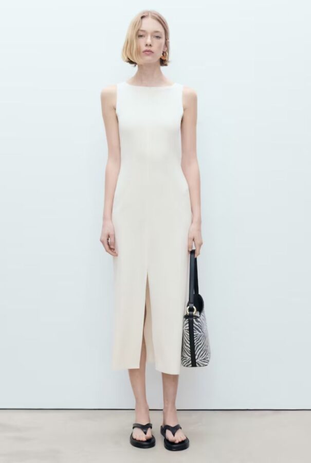 Minimal ma non anonimo, l’abito a colonna lavora in sottrazione. È il contrario dell’effetto da red carpet, ma è anche quello che si continua a indossare, stagione dopo stagione. La linea è dritta, ma non piatta. Cade bene, lascia spazio ai movimenti. Non cerca di evidenziare il punto vita, non chiede di essere riempito da curve precise, e in questo è liberatorio.