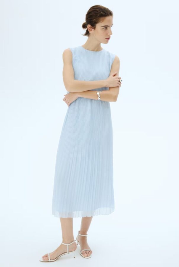 Le pieghe giuste fanno molto più di quanto sembrano. Portano il tessuto a muoversi, creano ritmo nella silhouette. L’abito midi a pieghe lavora in verticale, quindi accompagna, alleggerisce, suggerisce slancio. Non richiede accessori pesanti, non obbliga a un certo tipo di scarpa.