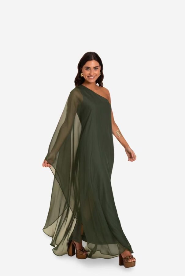 C’è un’eleganza discreta nei tagli asimmetrici. Non servono esagerazioni, basta una linea che si sposta da dove ce la si aspetta. L’abito con strascico laterale sfrutta proprio questo, un gioco sottile che attira l’occhio, snellisce, suggerisce slancio anche su una statura minuta. Non è un abito vistoso, ma sa farsi notare nel modo giusto.