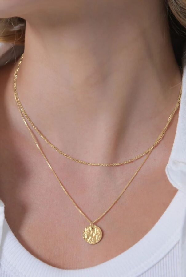 Questa collana gioca con la sovrapposizione ma senza forzature. Le due catene – una Figaro più corta e una veneziana leggermente più lunga – si intrecciano in modo naturale, dando movimento al décolleté senza sembrare studiate. Il ciondolo rotondo martellato aggiunge un tocco materico che rompe la linearità e cattura la luce nei punti giusti.
