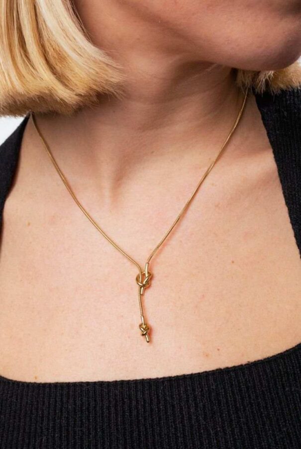 Il nodo è il dettaglio che cambia tutto. Lineare e centrale, ha un equilibrio grafico che cattura subito lo sguardo senza essere eccessivo. La struttura snake in acciaio inox è solida ma flessibile, quasi fluida sul collo. Si adatta bene sia a un look casual che a uno più strutturato.